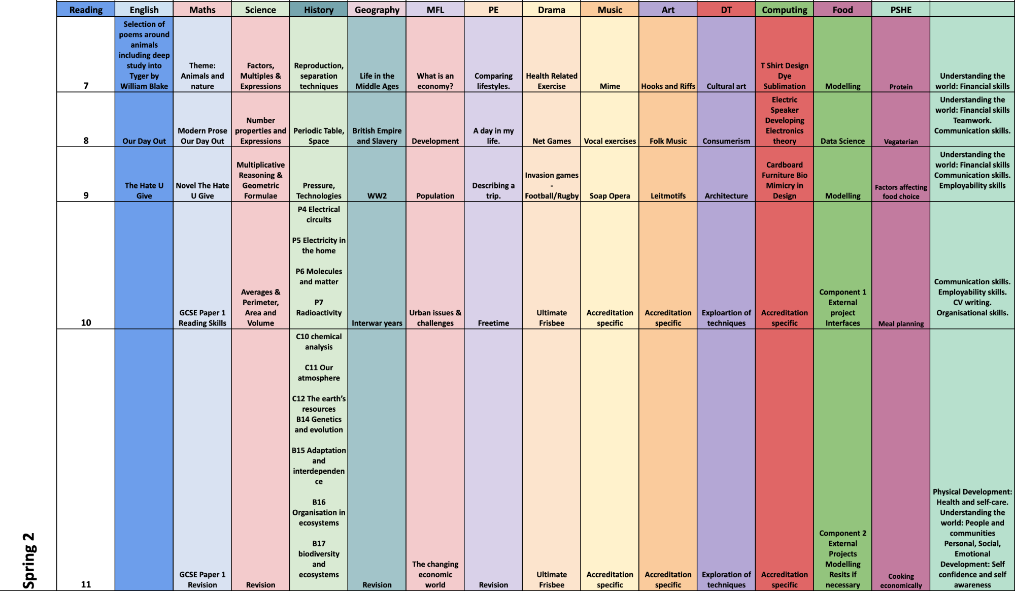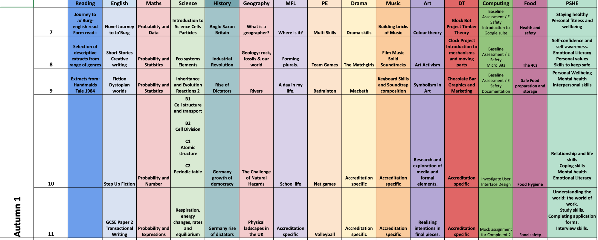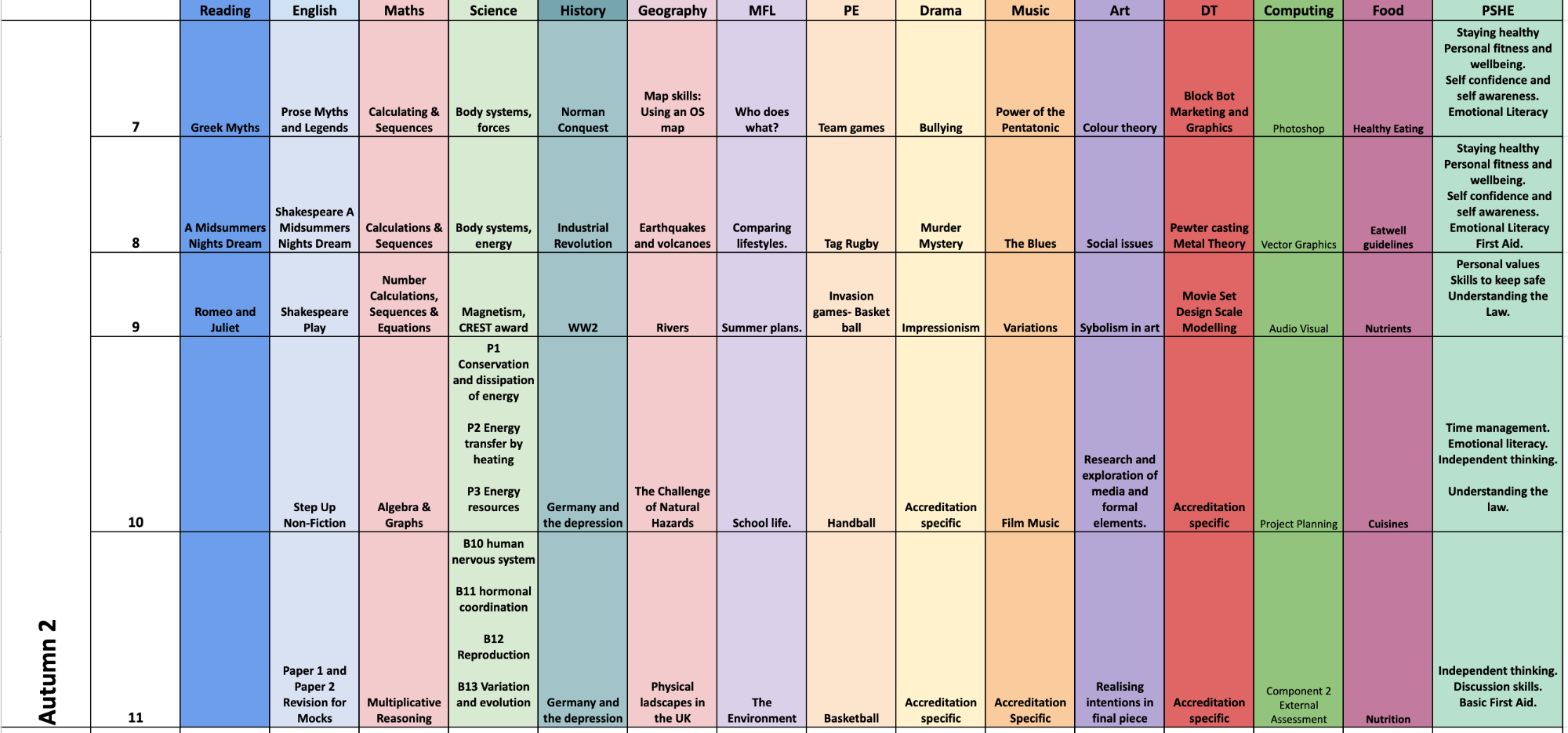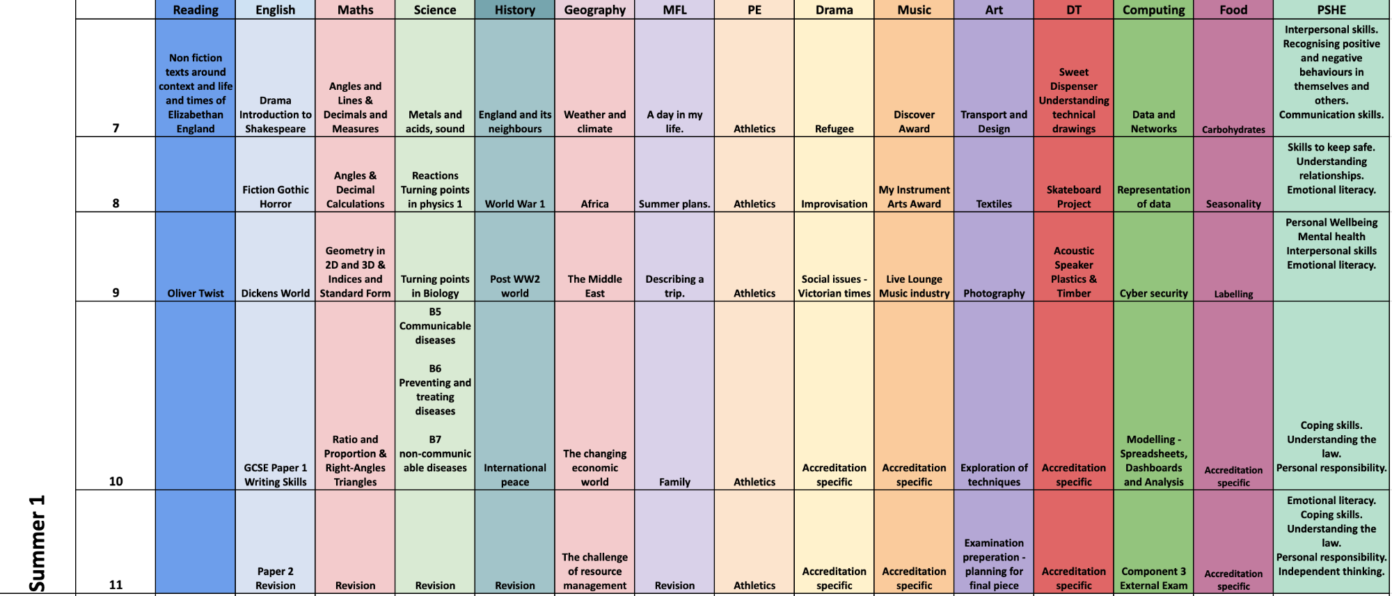 Pupils study English, Maths, Science, Computing, History, Geography, Design and Food Technology, Art, Music, Drama, Mandarin Chinese, Physical Education, R.E, Personal, Social, Health Education (PSHE).