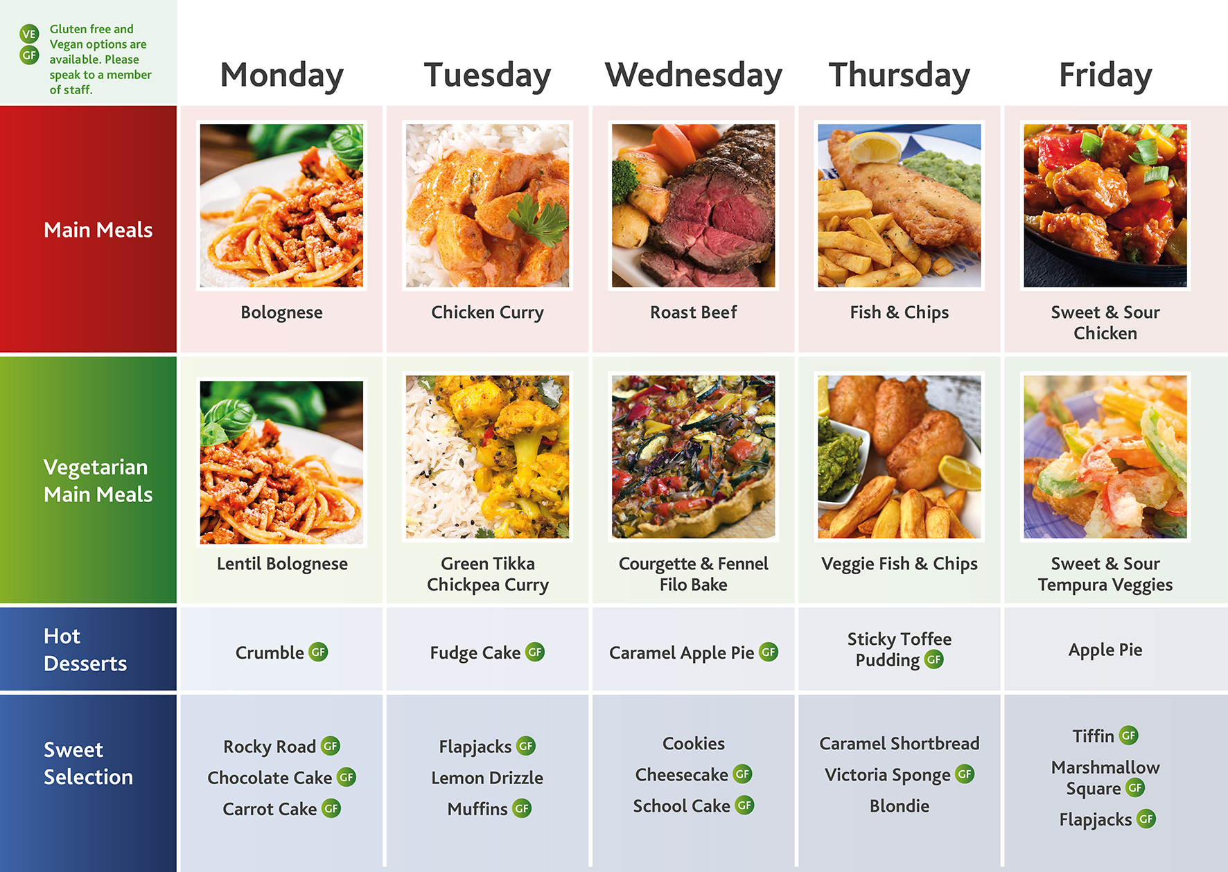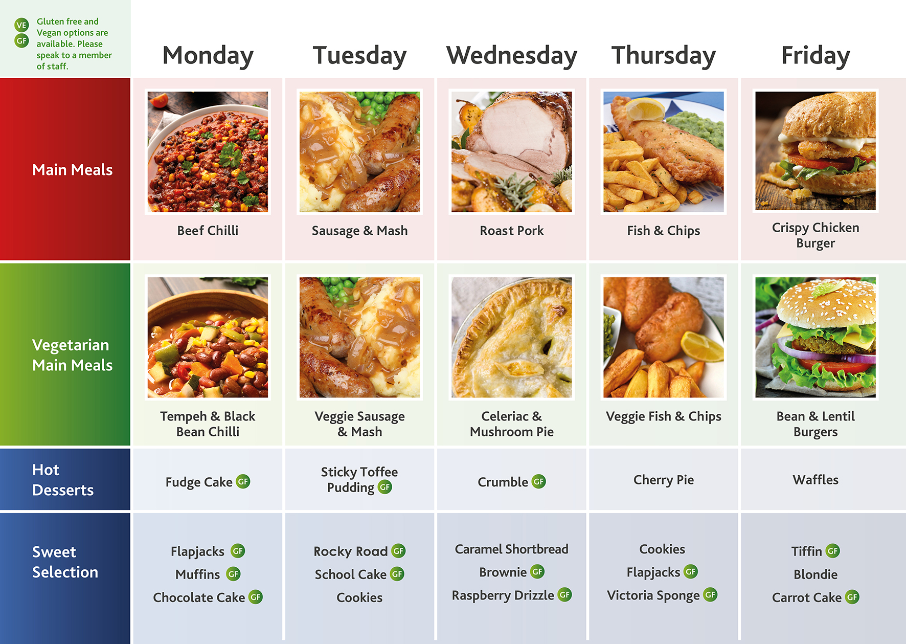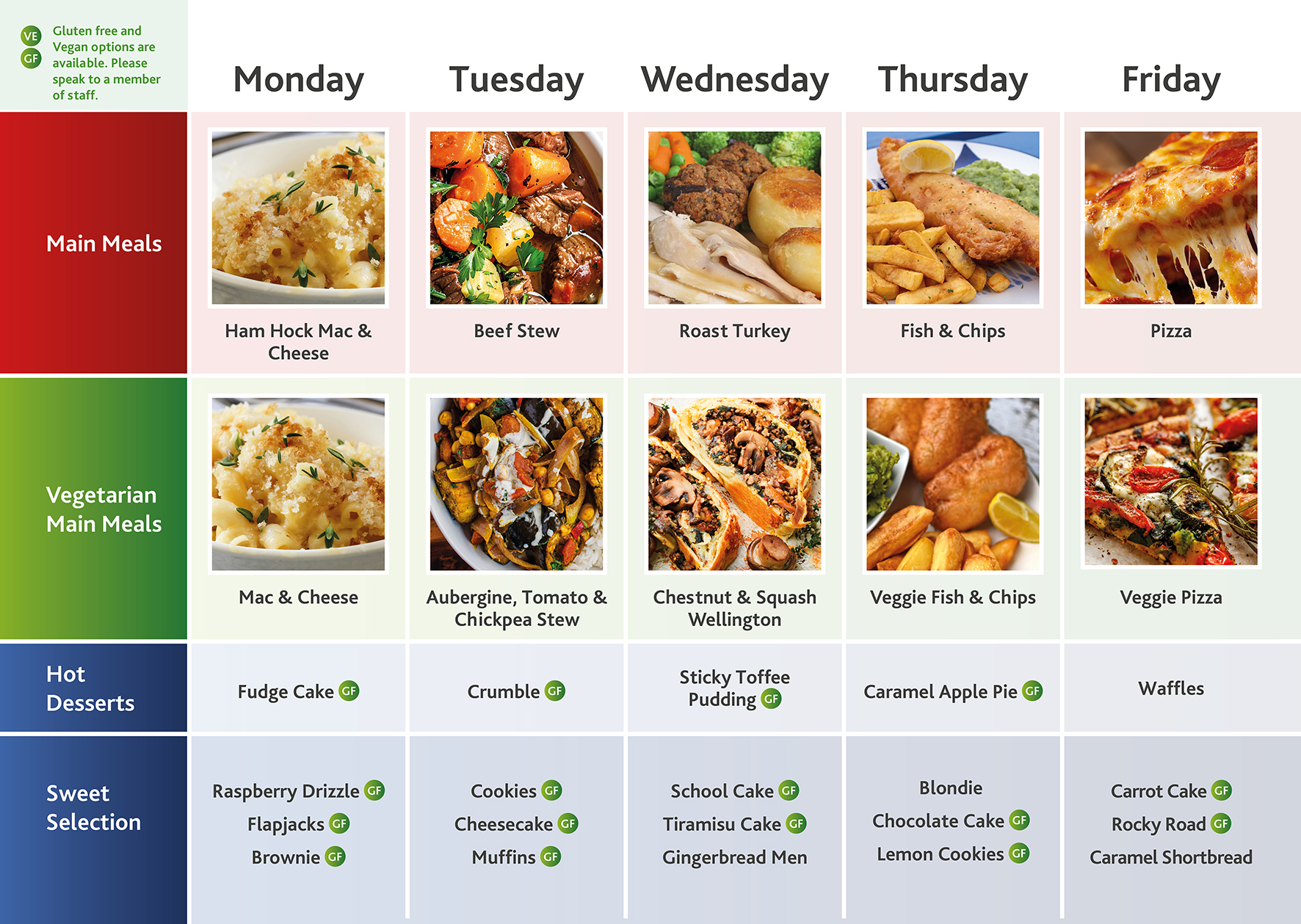 - Gluten free and vegan options for mains and desserts are available daily