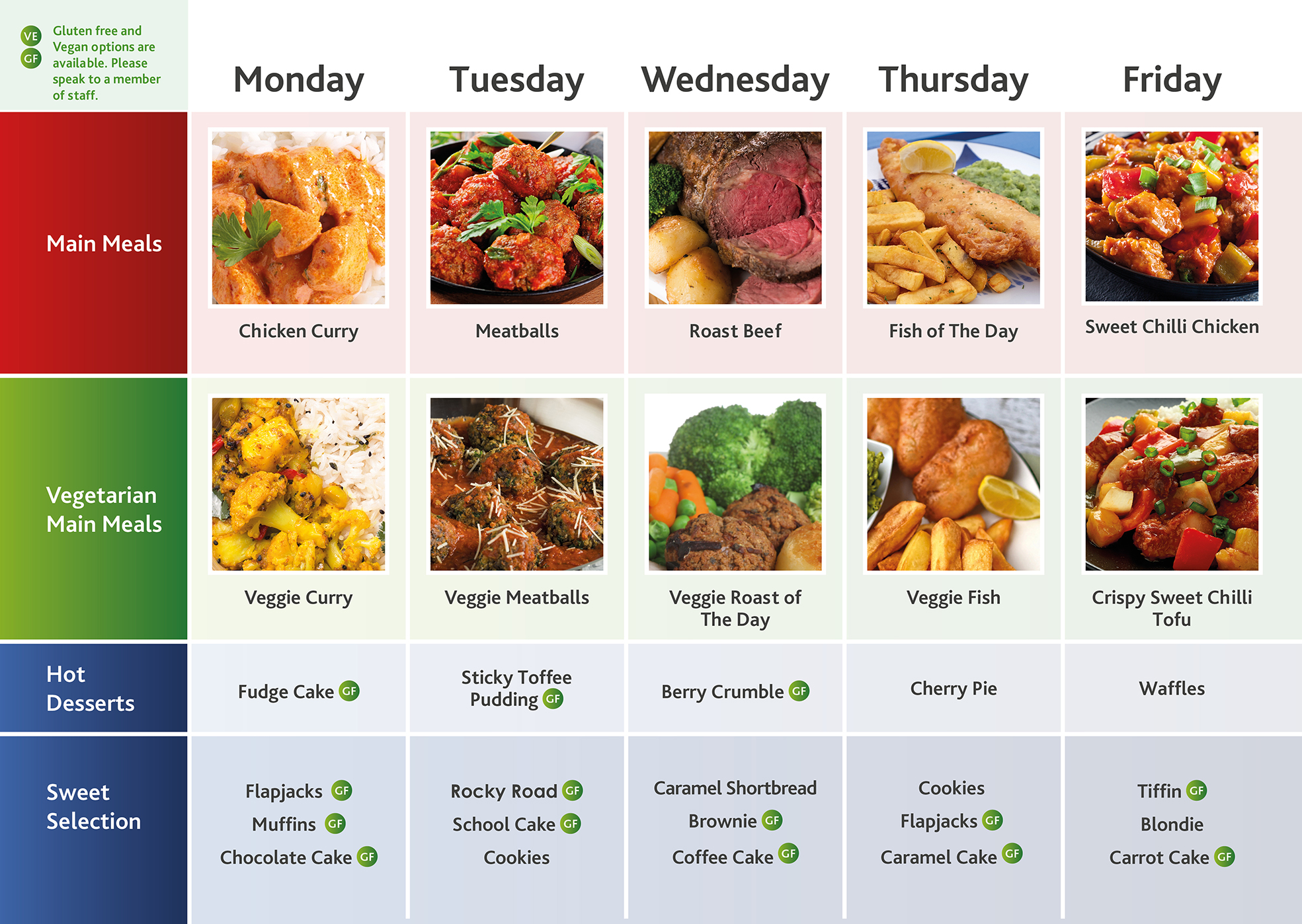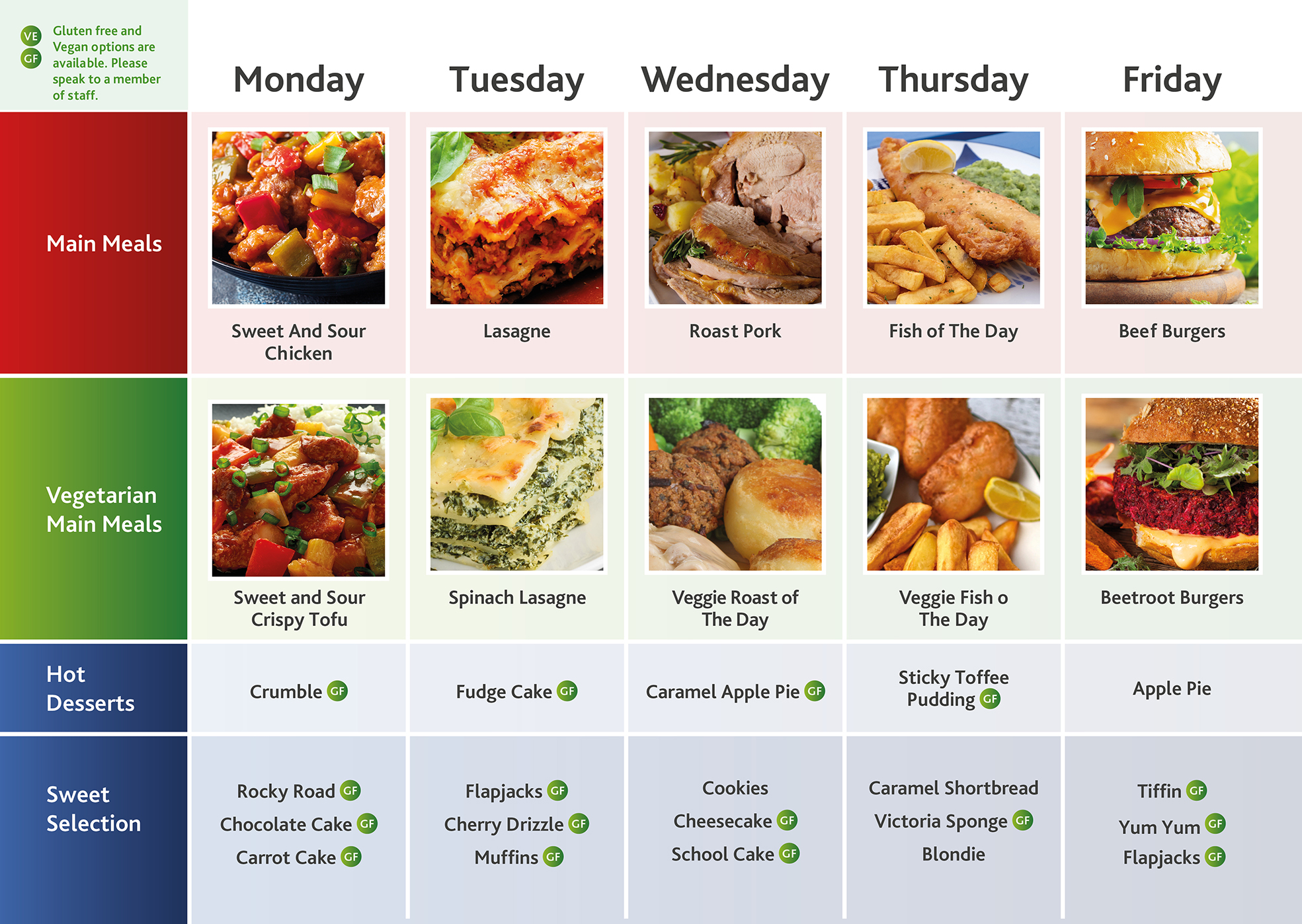 - Gluten free and vegan options for mains and desserts are available daily