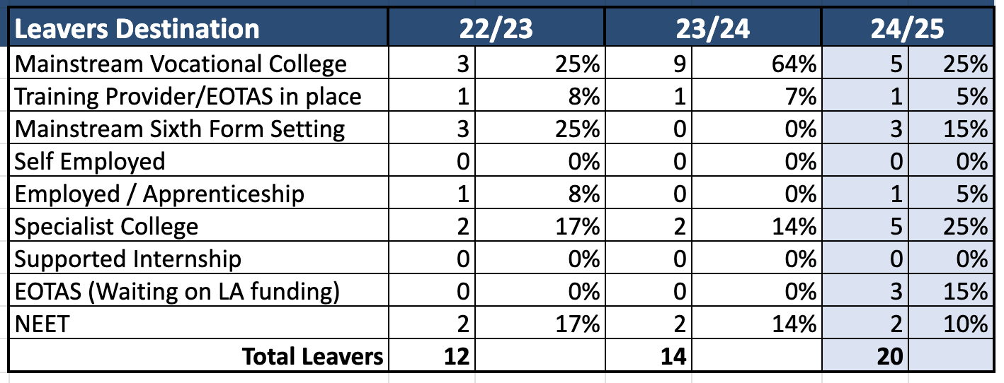 - Transition to specialist colleges account for 26% of leavers, showing a significant proportion of students require additional support and a nurturing environment