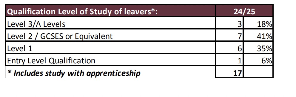 - 82% of leavers transitioned with up to Level 2 qualifications (GCSE or equiv). Of which 41% achieved Level 2 (GCSE or equiv)